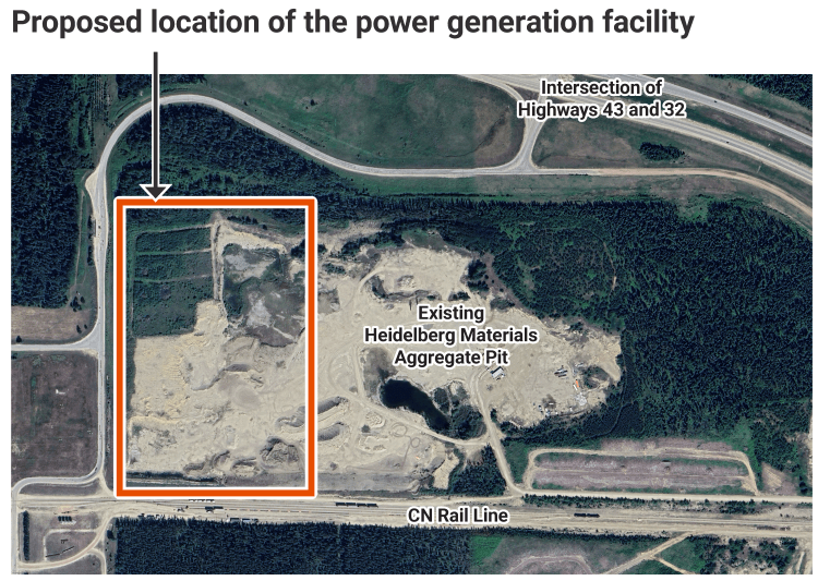 The power generation facility is proposed to be constructed on Alberta Crown lands at a brownfield site. The location is southwest of the intersection of highways 43 and 32, just north of the Athabasca River in Woodlands County near Whitecourt, AB.